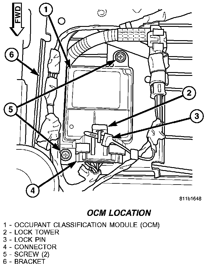 WARNING: ON VEHICLES EQUIPPED WITH THE OCCUPANT CLASSIFICATION SYSTEM (OCS), NEVER REPLACE BOTH THE OCCUPANT RESTRAINT CONTROLLER (ORC) AND THE OCCUPANT CLASSIFICATION MODULE (OCM) AT THE SAME TIME. IF BOTH REQUIRE REPLACEMENT, REPLACE THE OCM FIRST. THEN PERFORM THE AIRBAG SYSTEM TEST INCLUDING AN IGNITION- ON TIME OF AT LEAST ONE MINUTE BEFORE REPLACING THE ORC. BOTH THE ORC AND THE OCM STORE OCS CALIBRATION DATA, WHICH THEY TRANSFER TO ONE ANOTHER DURING THE FIRST MINUTE OF IGNITION-ON TIME AFTER ONE OF THEM IS REPLACED. IF BOTH MODULES ARE REPLACED AT THE SAME TIME, AN IRREVERSIBLE FAULT WILL BE SET IN BOTH MODULES.