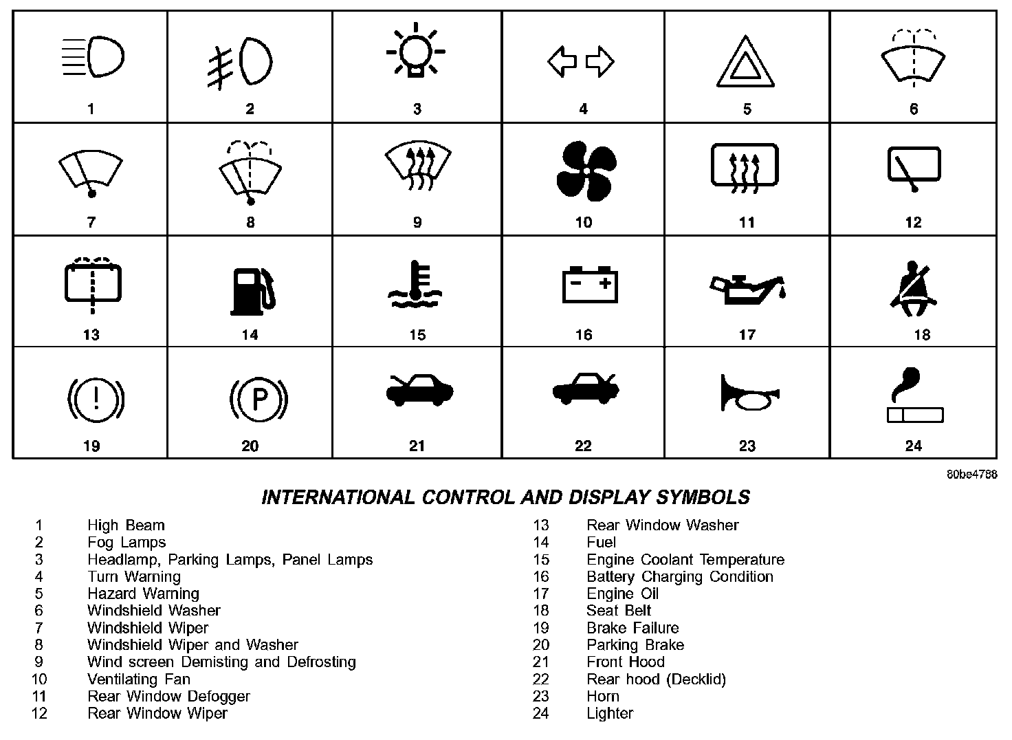 The graphic symbols illustrated in the following International Control and Display Symbols Chart are used to identify various instrument controls. The symbols correspond to the controls and displays that are located on the instrument panel.
