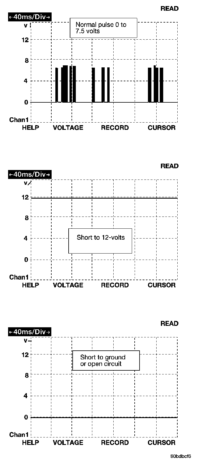 The bus messages are transmitted at a rate averaging 10800 bits per second. Since there is only voltage present when the modules transmit and the message length is only about 500 milliseconds, it is ineffective to try and measure the bus activity with a conventional voltmeter. The preferred method is to use the DRBIII(R) lab scope. The 12 v square wave selection on the 20-volt scale provides a good view of the bus activity. Voltage on the bus should pulse between zero and about seven and a half volts. Refer to the following figure for some typical displays.