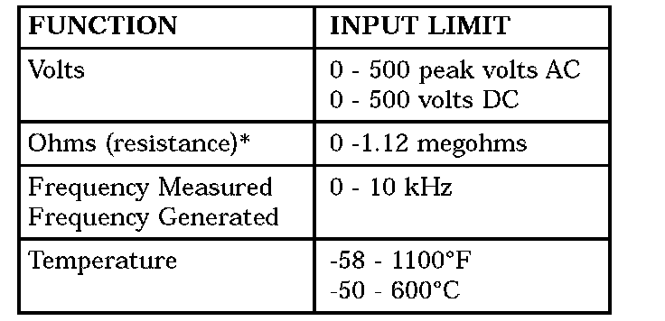 * Ohms cannot be measured if voltage is present. Ohms can be measured only in a non-powered circuit.