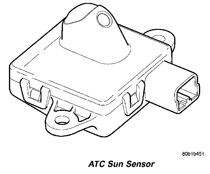 The sun sensor is not a thermistor type sensor, but rather a photo diode. For this reason the sun sensor responds to sun light intensity rather than temperature. The sun sensor is used to aid in determining proper mode and blend door positions and blower motor speed. The sun sensor is also used to sense day and night conditions for automatic headlight control, if equipped. The sun sensor has an LED indicator for the vehicle security system, if equipped.