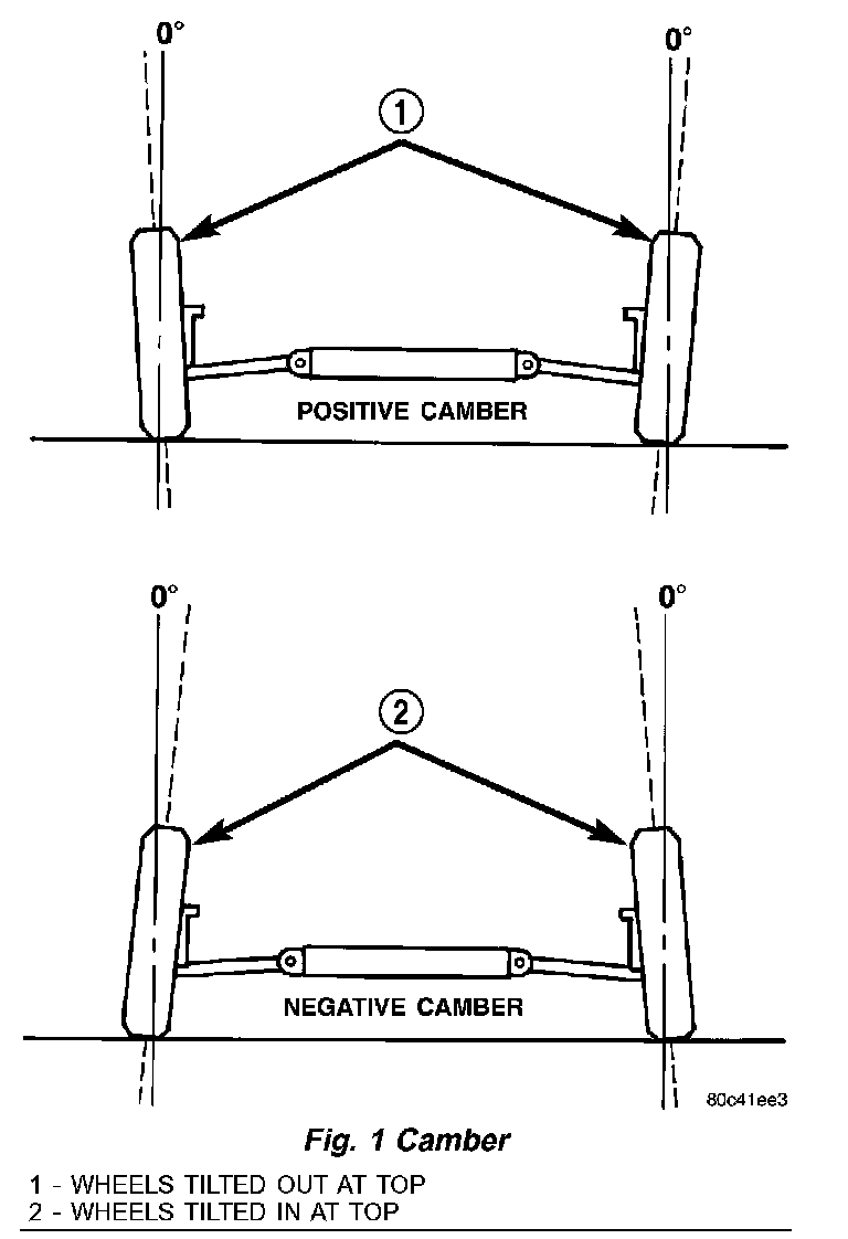 Camber is the inward or outward tilt of the top of the tire and wheel assembly (Fig. 1). Camber is measured in degrees of angle relative to a true vertical line. Camber is a tire wearing angle.