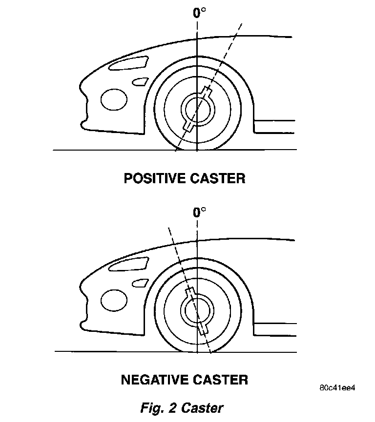Caster is the forward or rearward tilt of the steering knuckle in reference to the position of the upper and lower ball joints. Caster is measured in degrees of angle relative to a true vertical center line. This line is viewed from the side of the tire and wheel assembly (Fig. 2).