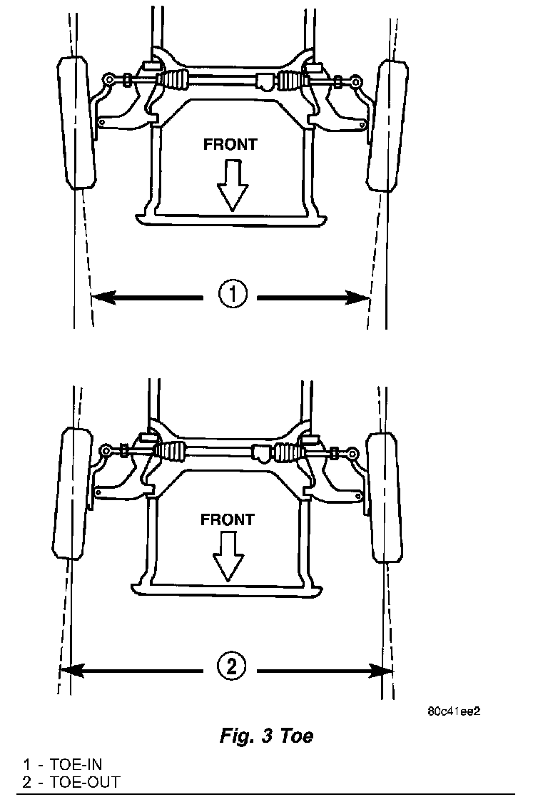 Toe is the inward or outward angle of the wheels as viewed from above the vehicle (Fig. 3).