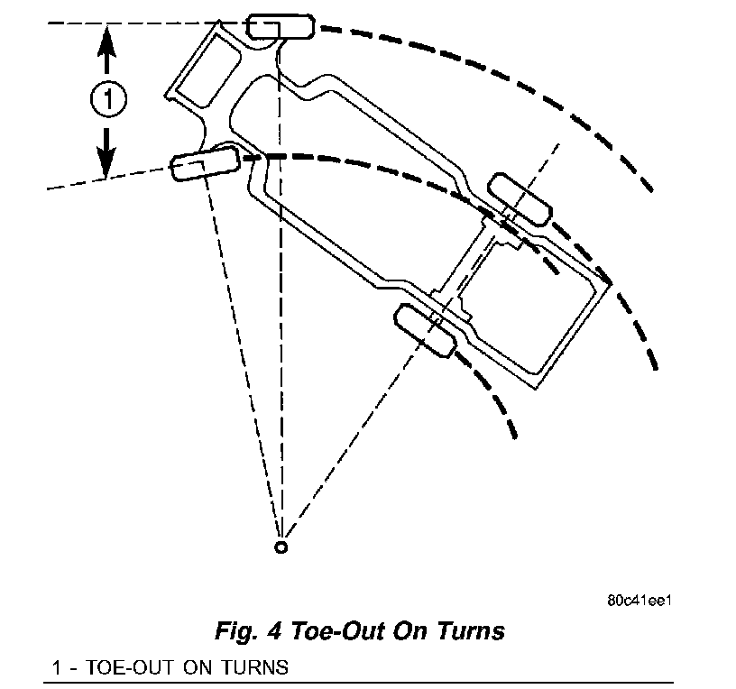 Toe-out on turns is the relative positioning of the front wheels while steering through a turn (Fig. 4). This compensates for each front wheel's turning radius. As the vehicle encounters a turn, the outboard wheel must travel in a larger radius circle than the inboard wheel. The steering system is designed to make each wheel follow its particular radius circle. To accomplish this, the front wheels must progressively toe outward as the steering is turned from center. This eliminates tire scrubbing and undue tire wear when steering a vehicle through a turn.