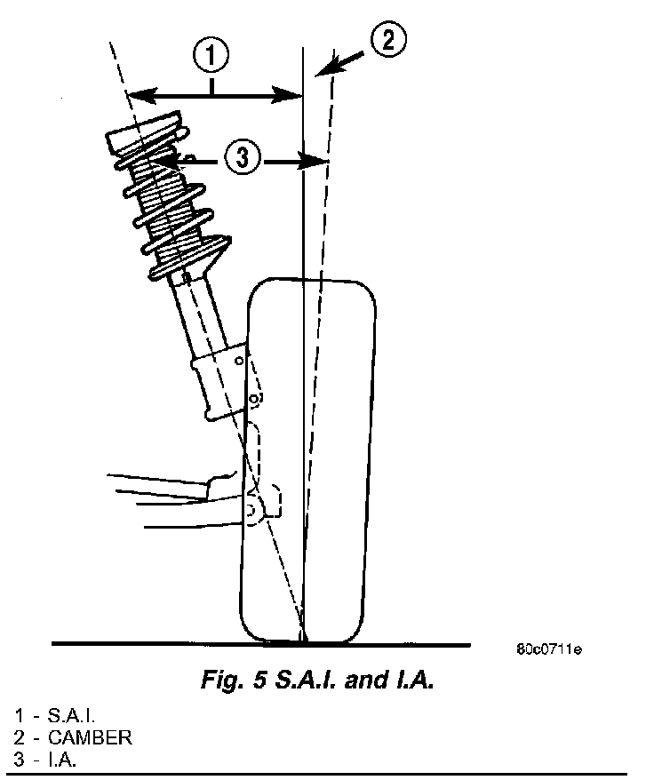 Steering axis inclination is the angle between a true vertical line starting at the center of the tire at the road contact point and a line drawn through the center of the upper ball joint (or strut) and the lower ball joint (Fig. 5). S.A.I. is built into the vehicle and is not an adjustable angle. If S.A.I. is not within specifications, a bent or damaged suspension component may be the cause.