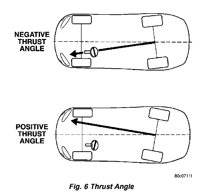 Thrust angle is the averaged direction the rear wheels are pointing in relation to the vehicle's center line (Fig. 6). The presence of negative or positive thrust angle causes the rear tires to track improperly to the left or right of the front tires (dog tracking).