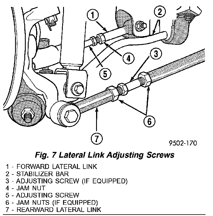 (a) Rough-in the rear camber setting as close as possible to the preferred specification by mainly rotating the rearward lateral link adjusting screw (Fig. 7). Some adjustment of the forward lateral link adjusting screw will also be required to get the rear camber setting to the preferred specification.