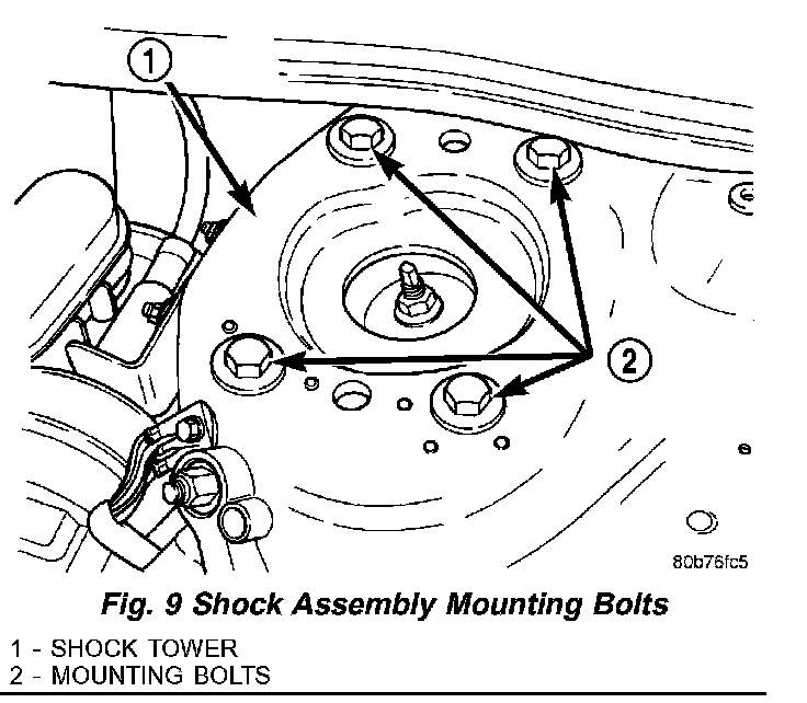 (1) Open the hood and mark the position of all four shock assembly mounting bolts on the shock tower (Fig. 9) on the side of the vehicle requiring front camber adjustment.