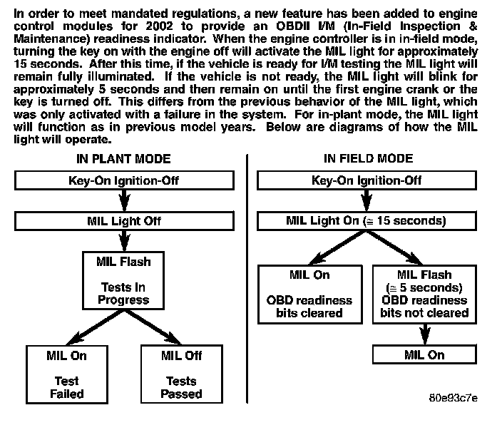The On Board Diagnostics have evolved to the second Generation of Diagnostics referred to as OBDII/Euro Stage III OBD. These OBDII/Euro Stage III OBD Diagnostics control the functions necessary to meet the requirements of California OBDII, Federal OBD regulations and European regulations. These requirements specify the inclusion of a Malfunction Indicator Light (MIL) located on the instrument panel. The purpose of the MIL is to inform the vehicle operator in the event of a malfunction of any emission system or component.