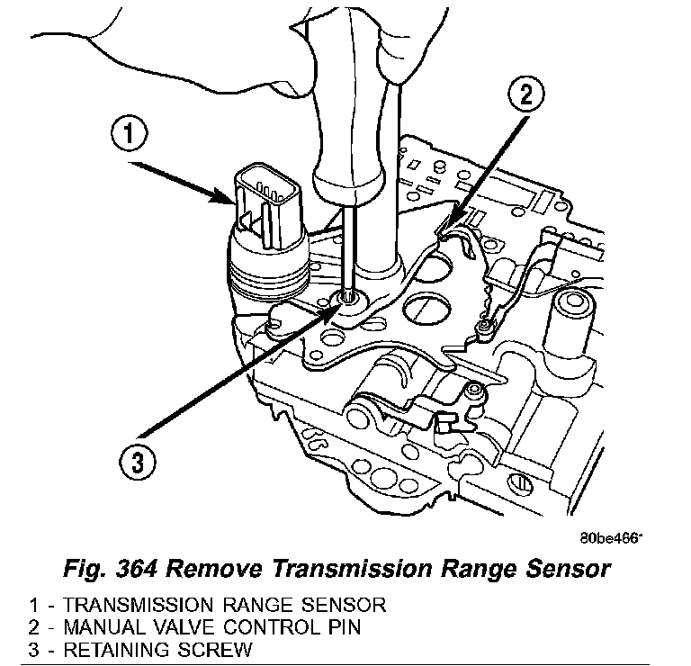 (2) Remove transmission range sensor retaining screw (3) (Fig. 363) and remove sensor (1) from valve body