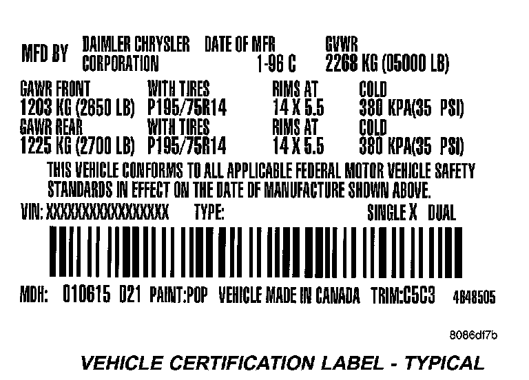 A vehicle certification label is attached to the rear shutface of the driver's door. This label indicates date of manufacture (month and year), Gross Vehicle Weight Rating (GVWR), Gross Axle Weight Rating (GAWR) front, Gross Axle Weight Rating (GAWR) rear and the Vehicle Identification Number (VIN). The Month, Day and Hour of manufacture is also included.
