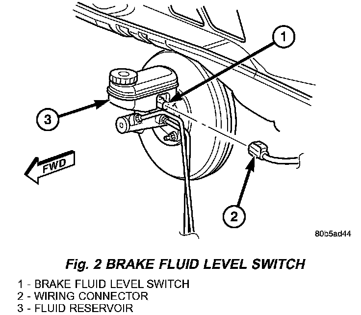 1. Remove wiring harness connector from brake fluid reservoir level switch on the side of the reservoir (Fig. 2).