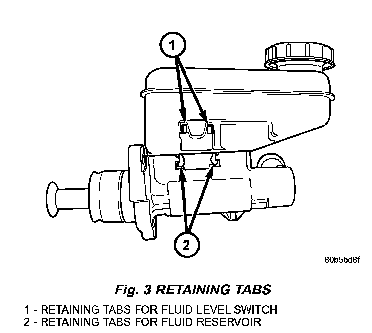 2. Using a small screwdriver, release the retaining tabs on the opposite end of brake fluid level switch (on right side of reservoir) securing it to the reservoir (Fig. 3).