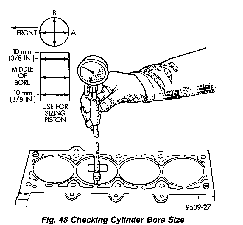 Measure the cylinder bore at three levels in directions A and B (Fig. 48). Top measurement should be 10 mm (3/8 inch) down and bottom measurement should be 10 mm (3/8 inch) up from bottom of bore.
