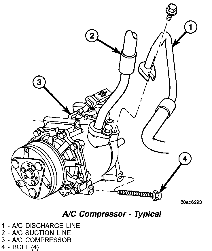 6. Disconnect the A/C suction and discharge lines from the A/C compressor and remove and discard the O-ring seals.