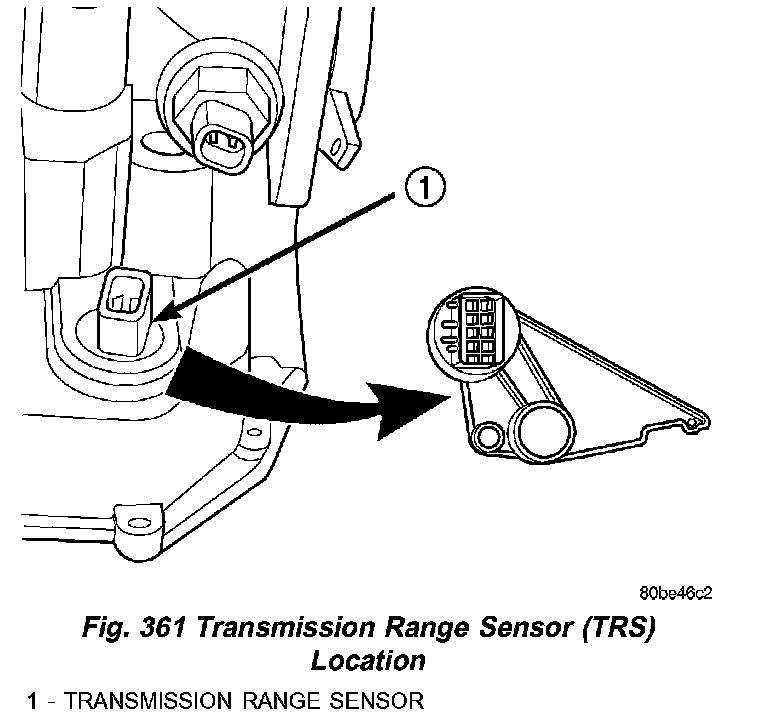 The Transmission Range Sensor (TRS) (1) (Fig. 361) is mounted to the top of the valve body inside the transaxle and can only be serviced by removing the valve body The electrical connector extends through the transaxle case.