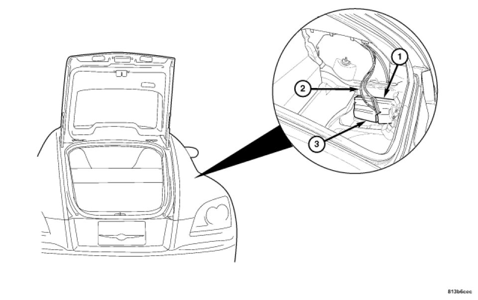 The Central Locking Pump/Security System Module (3) uses a combination of electrical wires (2) and air pressure/vacuum lines (1). The Central Locking Pump/Security System Module is located in the right rear of the luggage compartment underneath the trunk floor covering (4). It is wrapped in a sound deadening material in order to operate quietly without disturbing the vehicle operator.