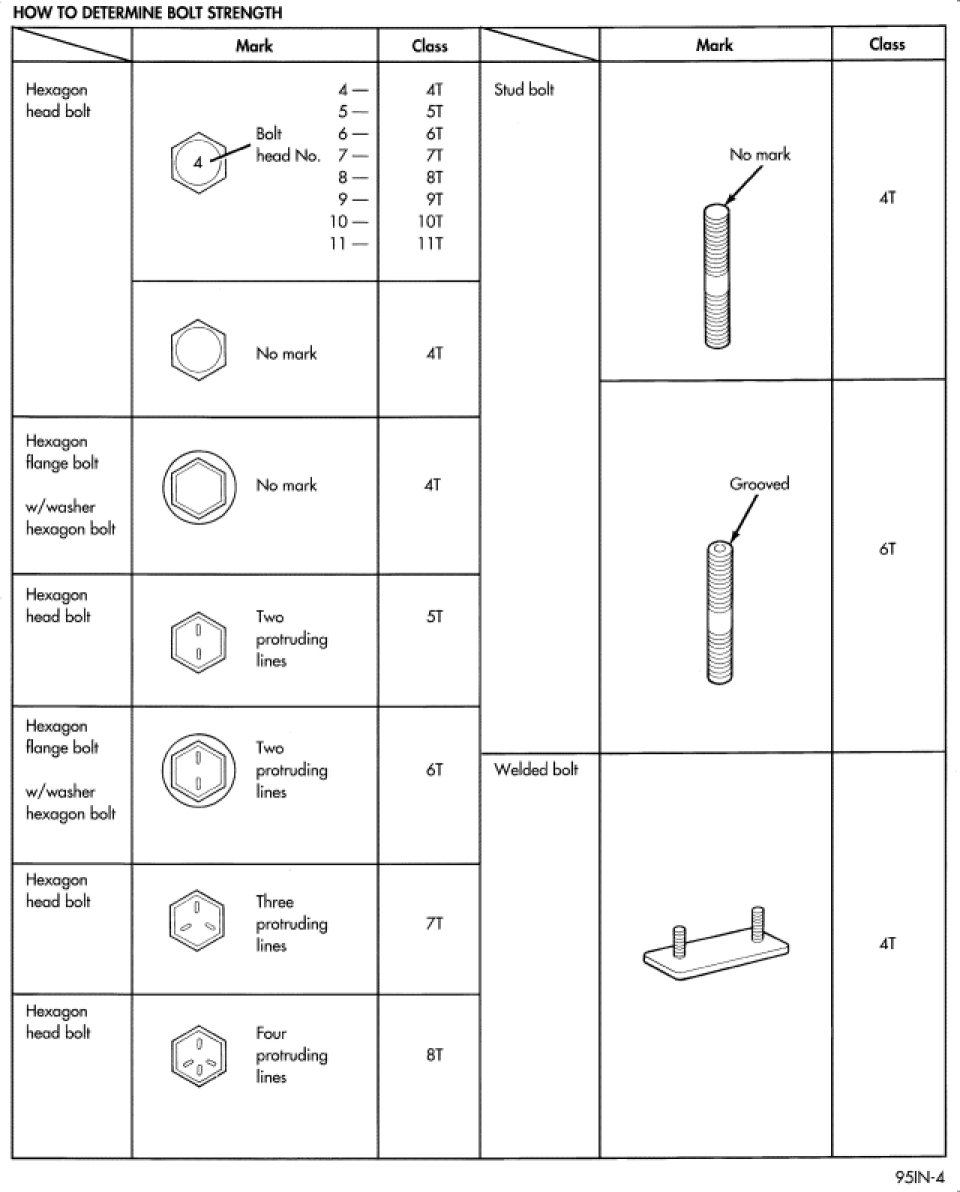 The SAE bolt strength grades range from grade 2 to grade 8. The higher the grade number, the greater the bolt strength. Identification is determined by the line marks on the top of each bolt head. The actual bolt strength grade corresponds to the number of line marks plus 2. The most commonly used metric bolt strength classes are 9.8 and 10.9. The metric strength class identification number is imprinted on the head of the bolt. The higher the class number, the greater the bolt strength. Some metric nuts are imprinted with a single-digit strength class on the nut face. Refer to the Fastener Identification and Fastener Strength Charts.