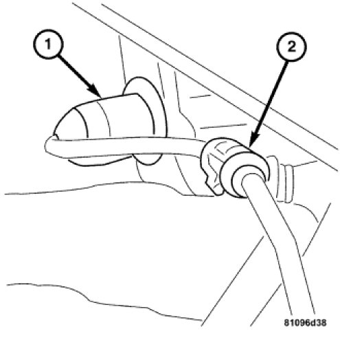 2. Install the rubber grommet (1) to the body and then hook the wheel speed sensor wire harness to the mount (2).