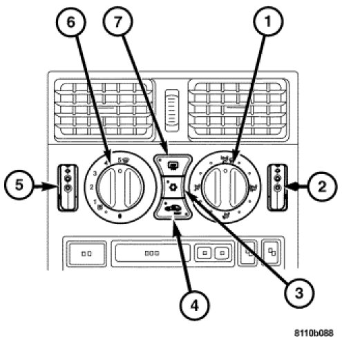 Both A/C heater control module panels are located on the instrument panel inboard of the steering column and above the radio. The A/C heater control panel contains two rotary-type temperature control knobs (2 and 5), a rotary-type mode control switch knob (1), a rotary-type blower motor speed switch knob (6) and an air conditioning compressor push button switch (3).