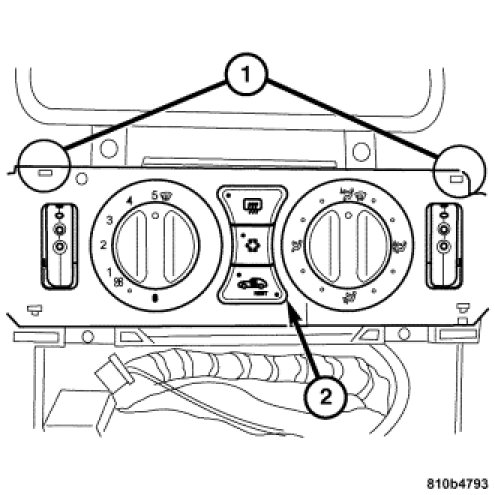 2. Install the A/C heater control module (2) by pressing in the catch lugs (1) at the sides.