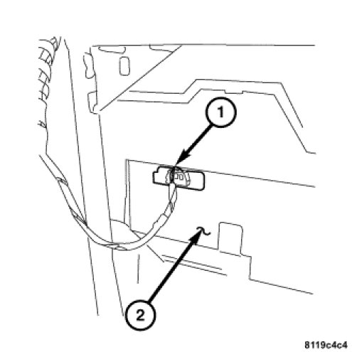 Install the heater core temperature sensor (1) to the front of the heater A/C case (2).