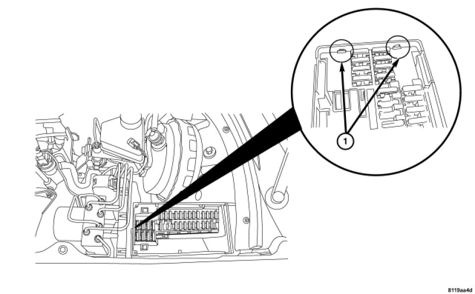 2. Push the underhood accessory fuse block down into the box until the rear tabs and the front two tabs (1) connect.