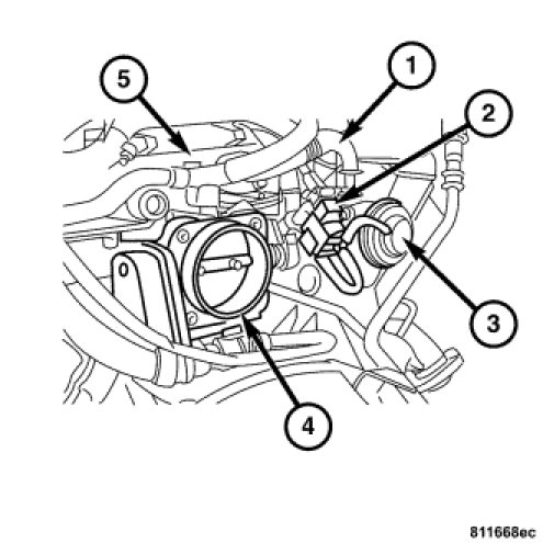 The EGR Valve (3) is located at the right rear of the engine and is attached to the right cylinder head, to the right of the Throttle Body (4).