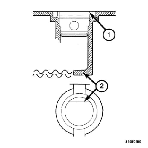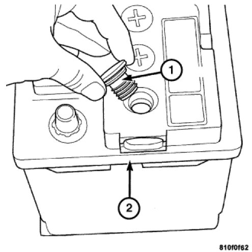 2. Look through the battery cap holes (1) to determine the level of the electrolyte in the battery. The electrolyte should be approximately 1 centimeter above the battery plates or until the lip (2) inside the battery cap holes is covered.