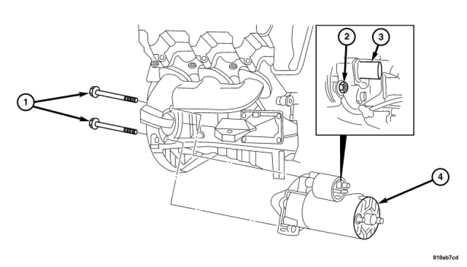 4. Install the starter bolts (1). Tighten to 42 Nm (31 ft. lbs.).