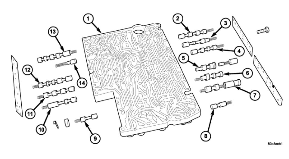 2. Install all valves and springs from the valve body (1). Check all valves for ease of movement and shavings.