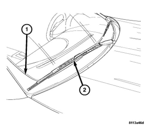 4. Align the center of the wiper blade (2) with the top of the dot matrix (1) on the bottom of the windshield. Torque the wiper arm retaining nut to 19 Nm (14 ft. lbs.).