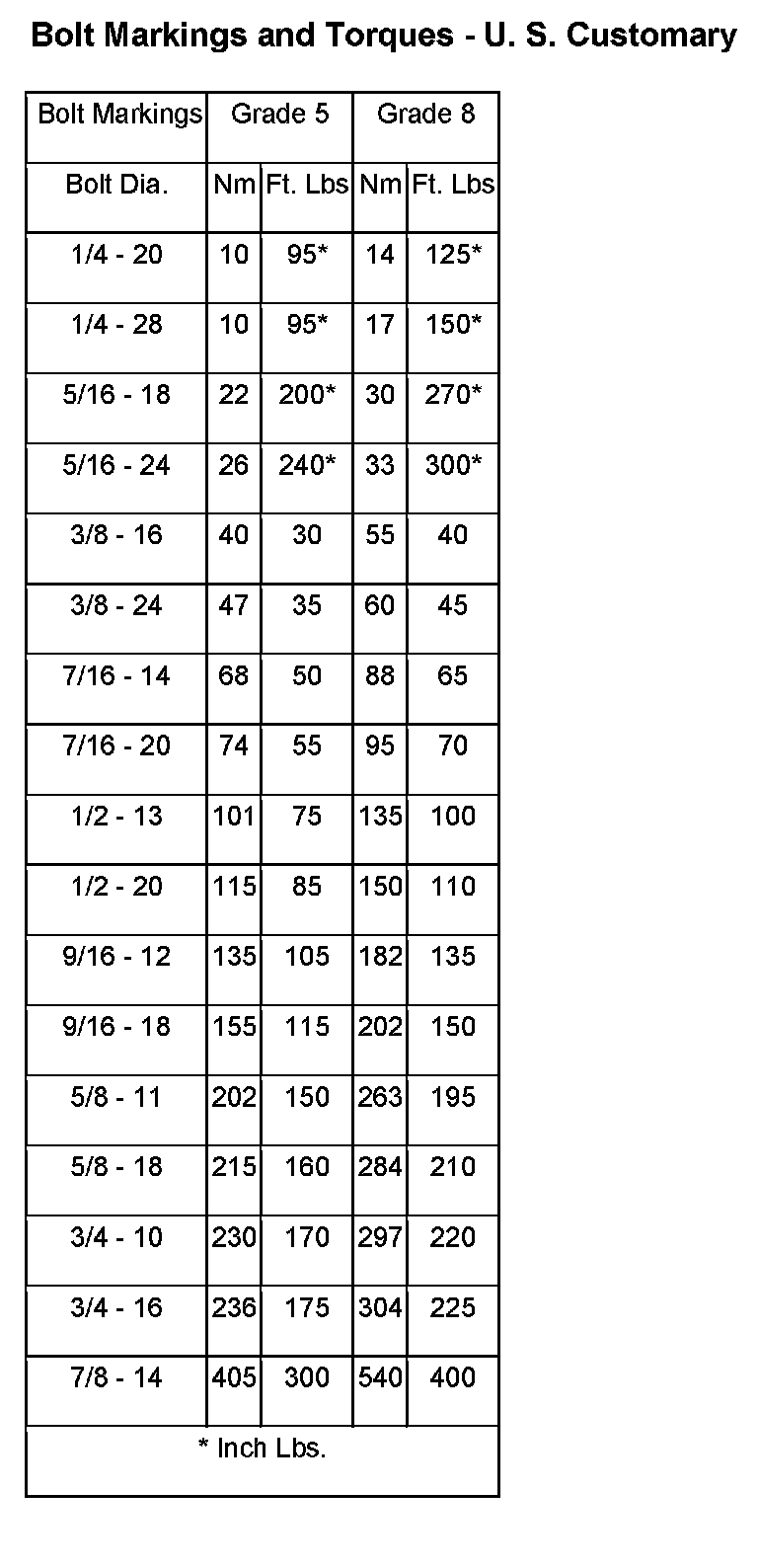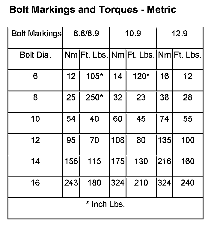 The SAE bolt strength grades range from grade 2 to grade 8. The higher the grade number, the greater the bolt strength. Identification is determined by the line marks on the top of each bolt head. The actual bolt strength grade corresponds to the number of line marks plus 2. The most commonly used metric bolt strength classes are 9.8 and 10.9. The metric strength class identification number is imprinted on the head of the bolt. The higher the class number, the greater the bolt strength. Some metric nuts are imprinted with a single-digit strength class on the nut face. Refer to the Fastener Identification and Fastener Strength Charts.