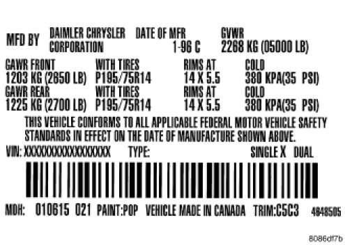 A vehicle certification label is attached to the rear shutface of the driver's door. This label indicates date of manufacture (month and year), Gross Vehicle Weight Rating (GVWR), Gross Axle Weight Rating (GAWR) front, Gross Axle Weight Rating (GAWR) rear and the Vehicle Identification Number (VIN). The Month, Day and Hour of manufacture is also included.
