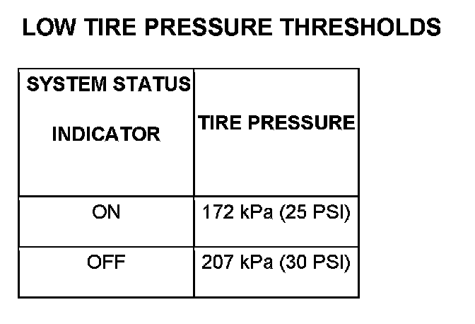 The SKREEM monitors the signals from the tire pressure sensor/transmitters and determines if any tire has gone below the low pressure threshold LOW TIRE PRESSURE THRESHOLDS table.