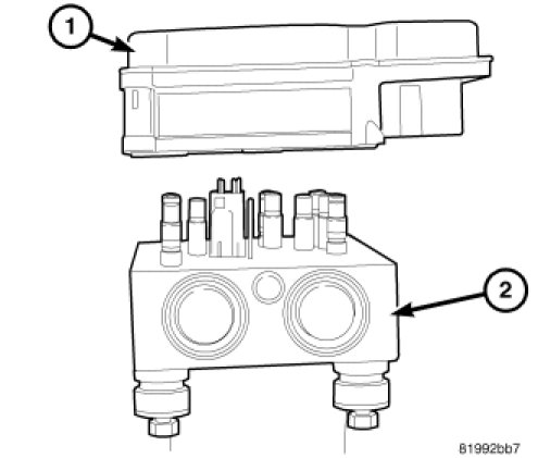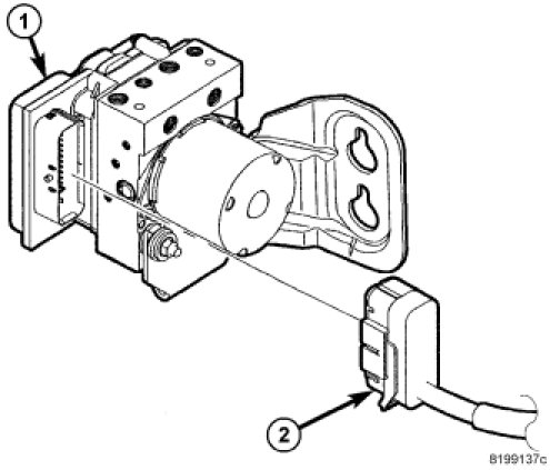 2. Align ABM (1) solenoids and pump/motor wiring with HCU (2) valves and wiring passage. Slide ABM onto HCU.