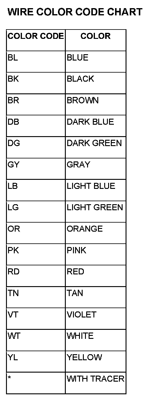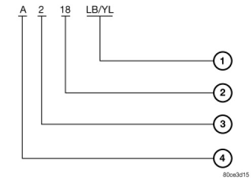 Each wire shown in the diagrams contains a code which identifies the main circuit, part of the main circuit, gage of wire, and color.