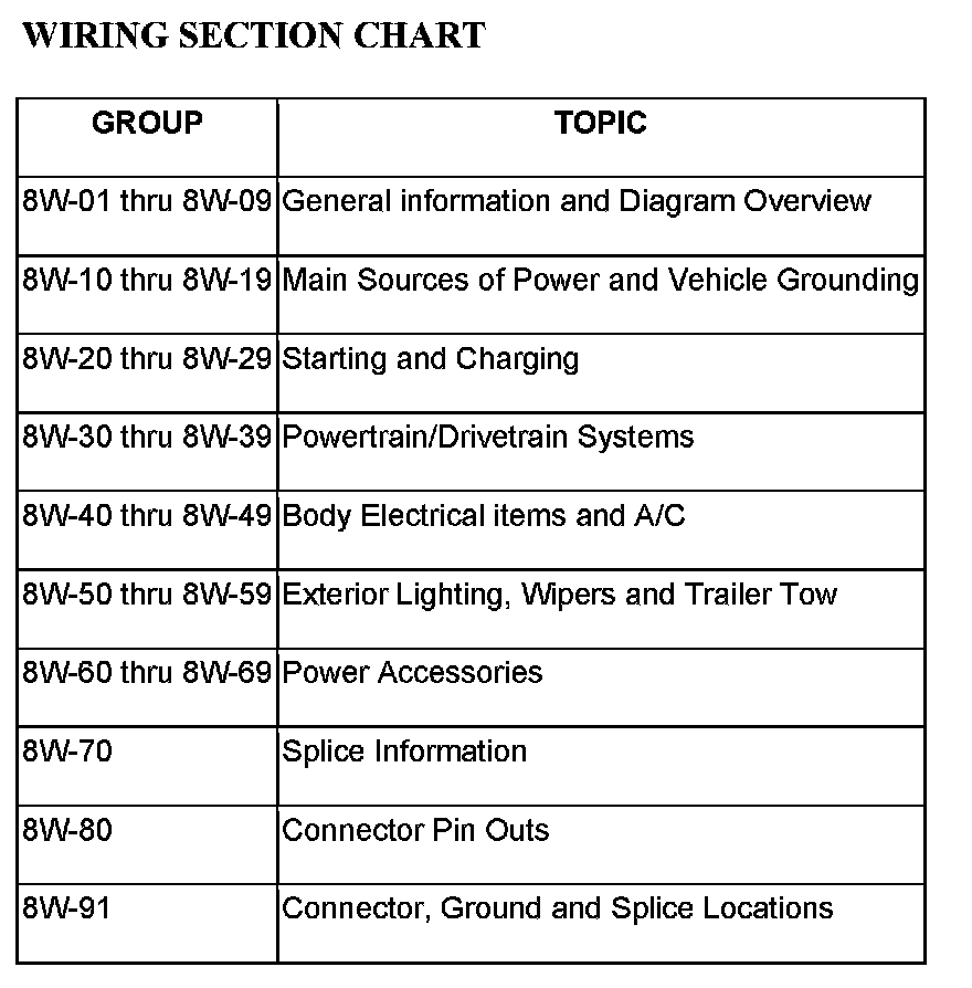 The wiring diagrams are grouped into individual sections. If a component is most likely found in a particular group, it will be shown complete (all wires, connectors, and pins) within that group. For example, the Auto Shutdown Relay is most likely to be found in Powertrain Management, so it is shown there complete. It can, however, be shown partially in another group if it contains some associated wiring.