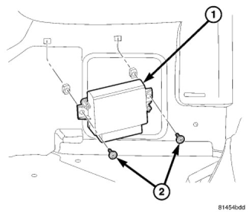 1. Position the Park Assist Module (1) and install the two attaching screws (2). Tighten screws to 3.5 Nm (30 in. lbs.).