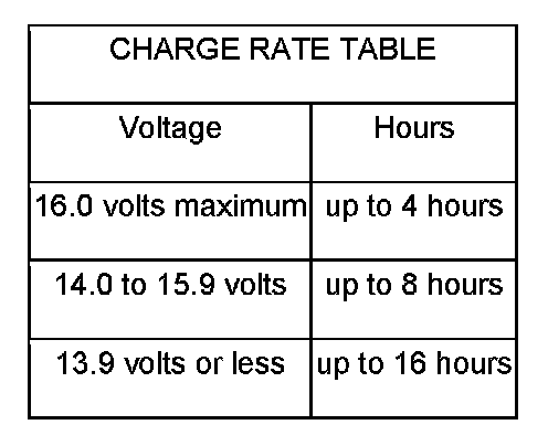 3. Battery chargers vary in the amount of voltage and current they provide. The amount of time required for a battery to accept measurable charging current at various voltages is shown in the Charge Rate Table. If the charging current is still not measurable at the end of the charging time, the battery is inoperative and must be replaced. If the charging current is measurable during the charging time, the battery may be good and the charging should be completed in the normal manner.