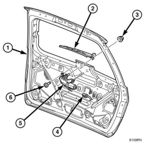1. Position the rear wiper motor (5) into position on the liftgate (1) and install the three rear wiper motor mounting screws (6). Tighten screws to 6 Nm (55 in. lbs.).