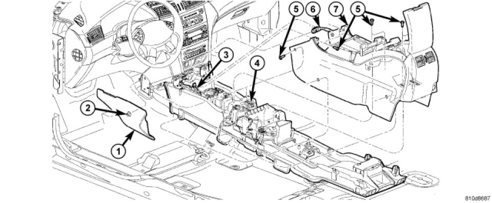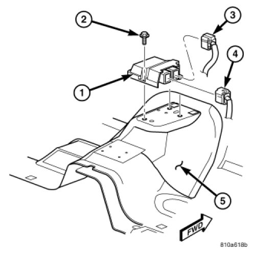 4. Remove the three retaining screws (2) to the ORC (1). One on the left side of the floor tunnel, and one in front of (toward bulkhead) and behind (toward vehicle rear) the ORC unit.