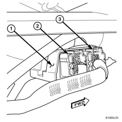 3. From the right side of the vehicle, disconnect the two ORC electrical connectors (2 and 3, referred to as C1 and C2 in the diagnostic information and wiring).
