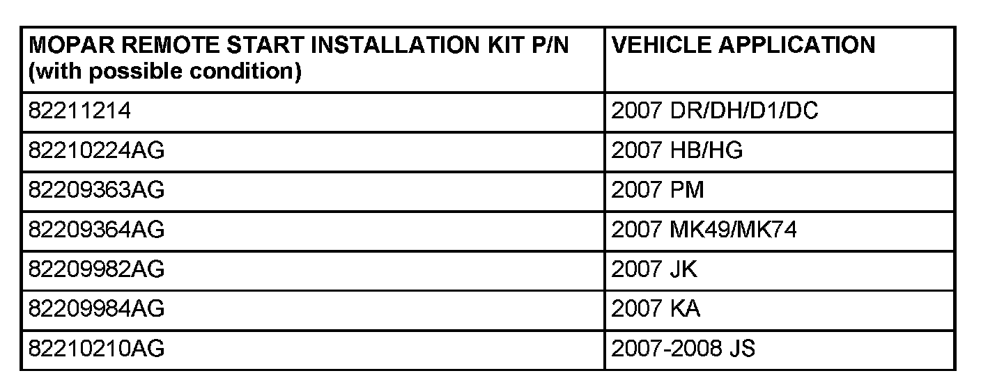 The above condition(s) may be present ONLY if one of the following specific kit part numbers for the Mopar Remote Start Installation Kit had been installed previously on the suspect vehicle.