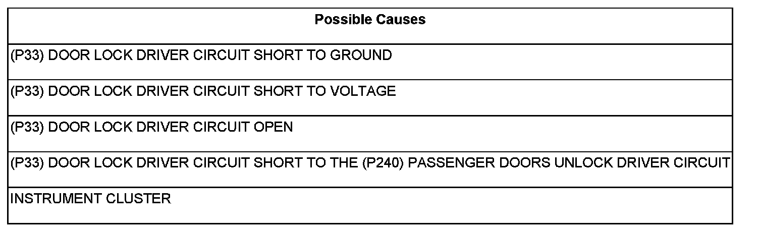 - Repair the (P33) Door Lock Driver for a short to the (P240) Passenger Doors Unlock Driver circuit.