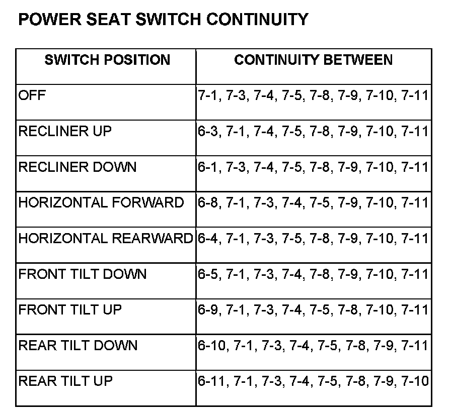 3. Use an ohmmeter to test the continuity of the power seat switch. Refer to POWER SEAT SWITCH CONTINUITY table. If not OK, replace the faulty power seat switch. If switch tests OK Refer to Power Seat Testing.