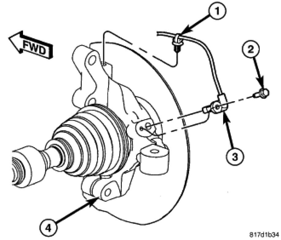 1. Install the wheel speed sensor head (3) into the knuckle (4). Install the mounting screw (2) and tighten it to 12 Nm (106 in. lbs.).