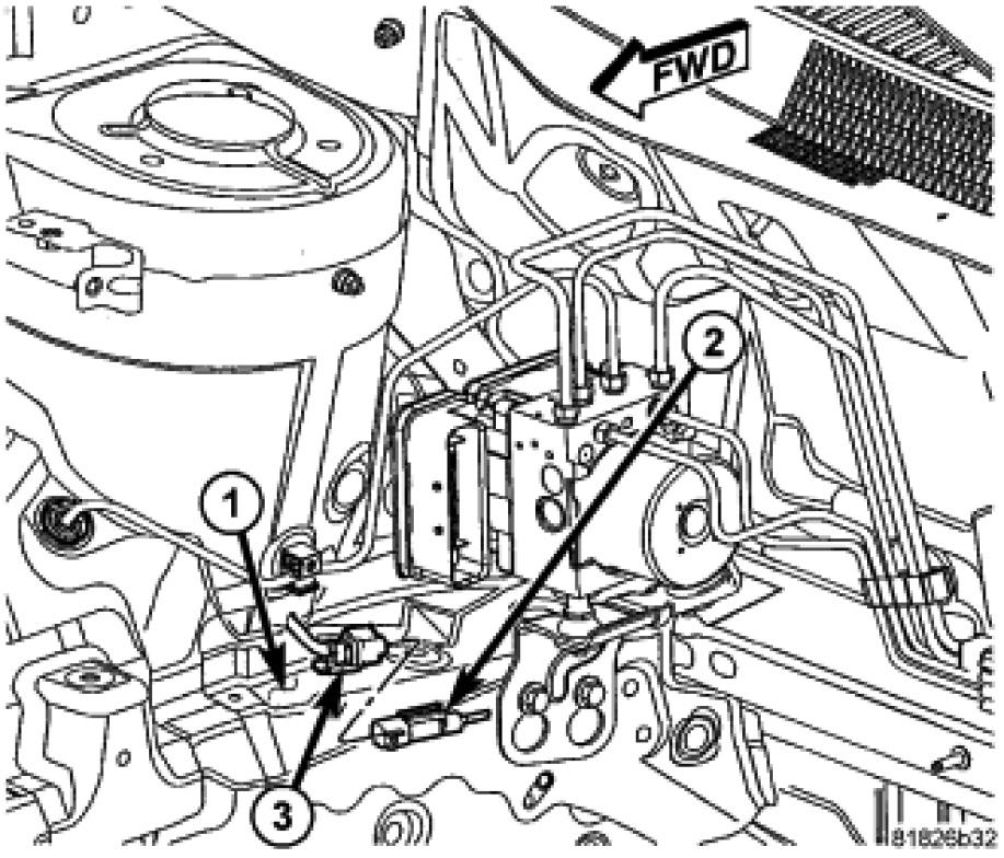8. Connect the wheel speed sensor cable connector (2) to the wiring harness connector (3) on top of the frame rail (1).