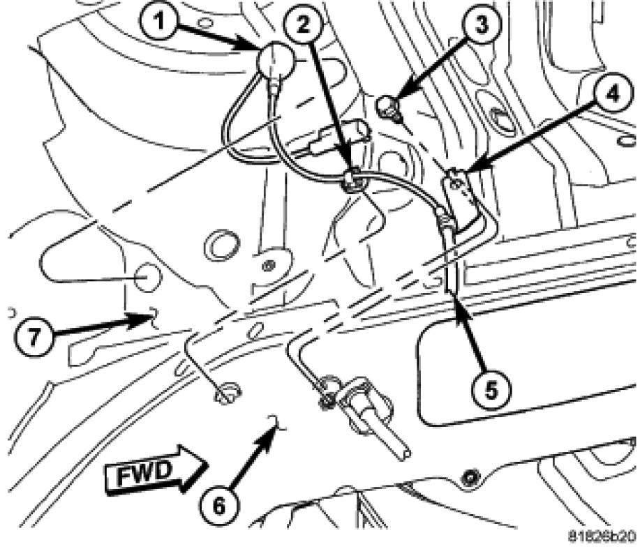4. Position the wheel speed sensor cable routing clamp (4) on the outside frame rail (6) and install the mounting screw (3). Tighten the mounting screw to 18 Nm (13 ft. lbs.).